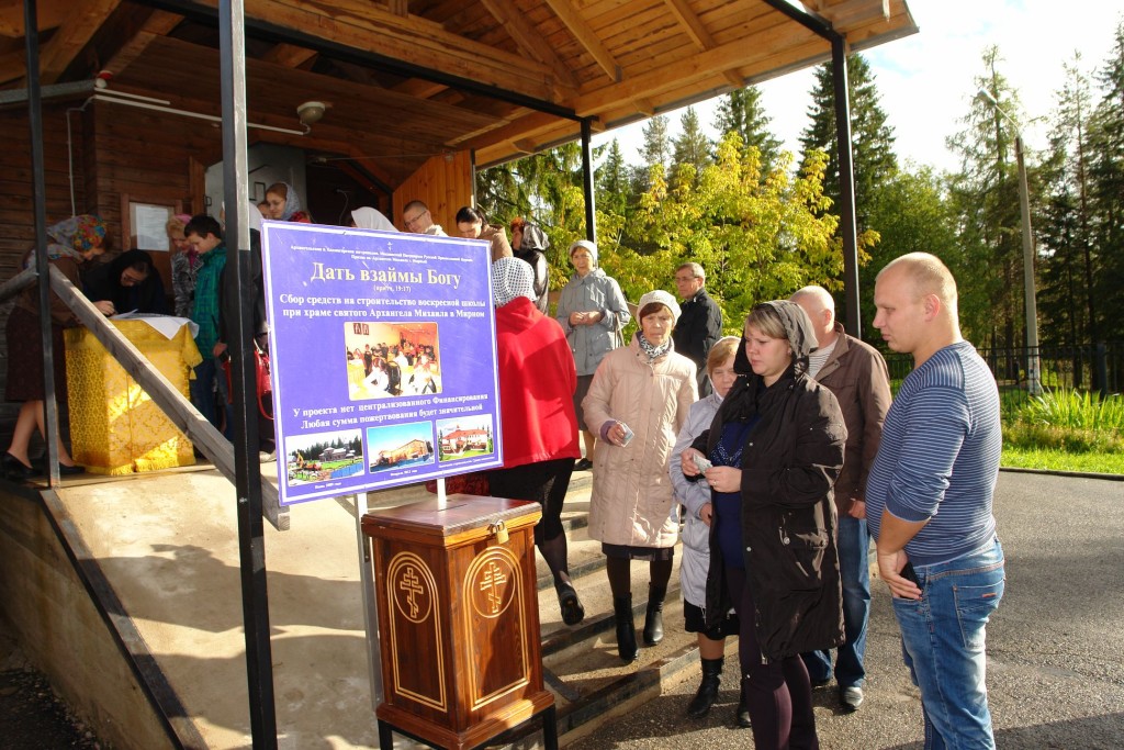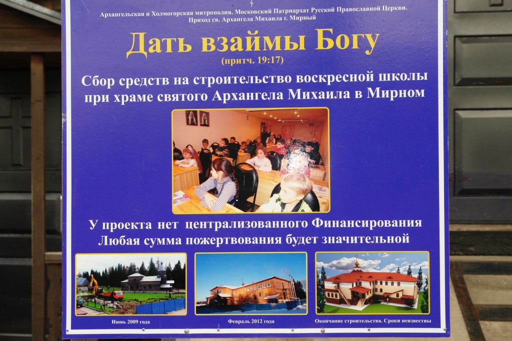 6 сентября после молебна о строительстве воскресной школы была начата благотворительная акция «Твое имя в истории воскресной школы». В первый же день было оплачено 59 досок для финишной отделки воскресной школы, три из которых подписали губернатор Архангельской области, начальник космодрома и глава Мирного.