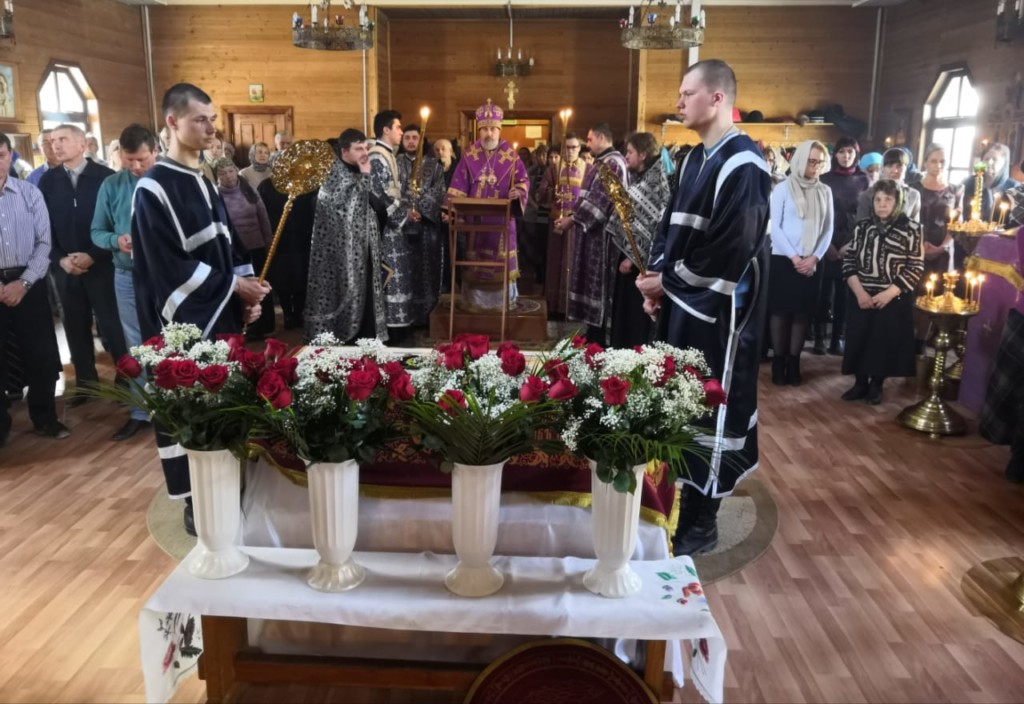На фото: 26 апреля, епископ Плесецкий и Каргопольский Александр совершает Вечерню с выносом Плащаницы и малое повечерие с каноном на плач Пресвятой Богородицы в храме святого Архистратига Михаила в Мирном.
